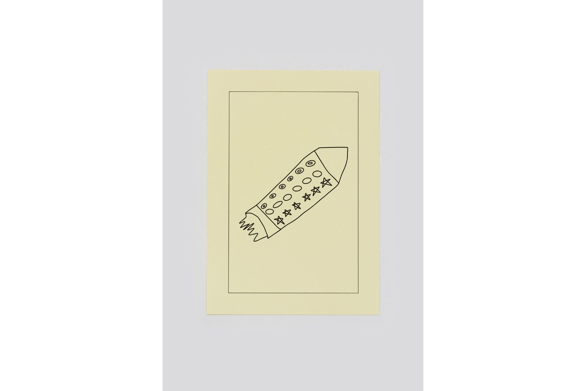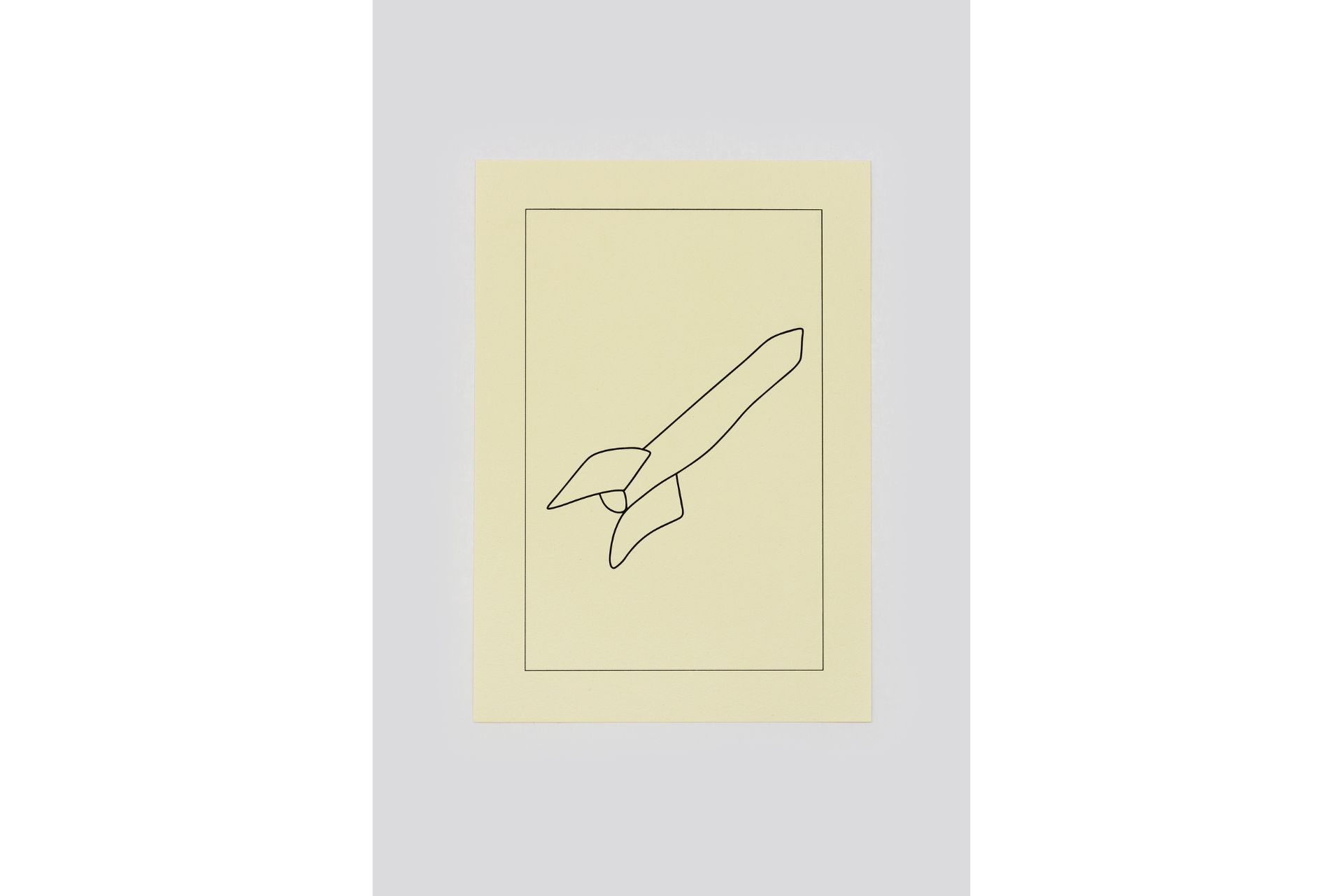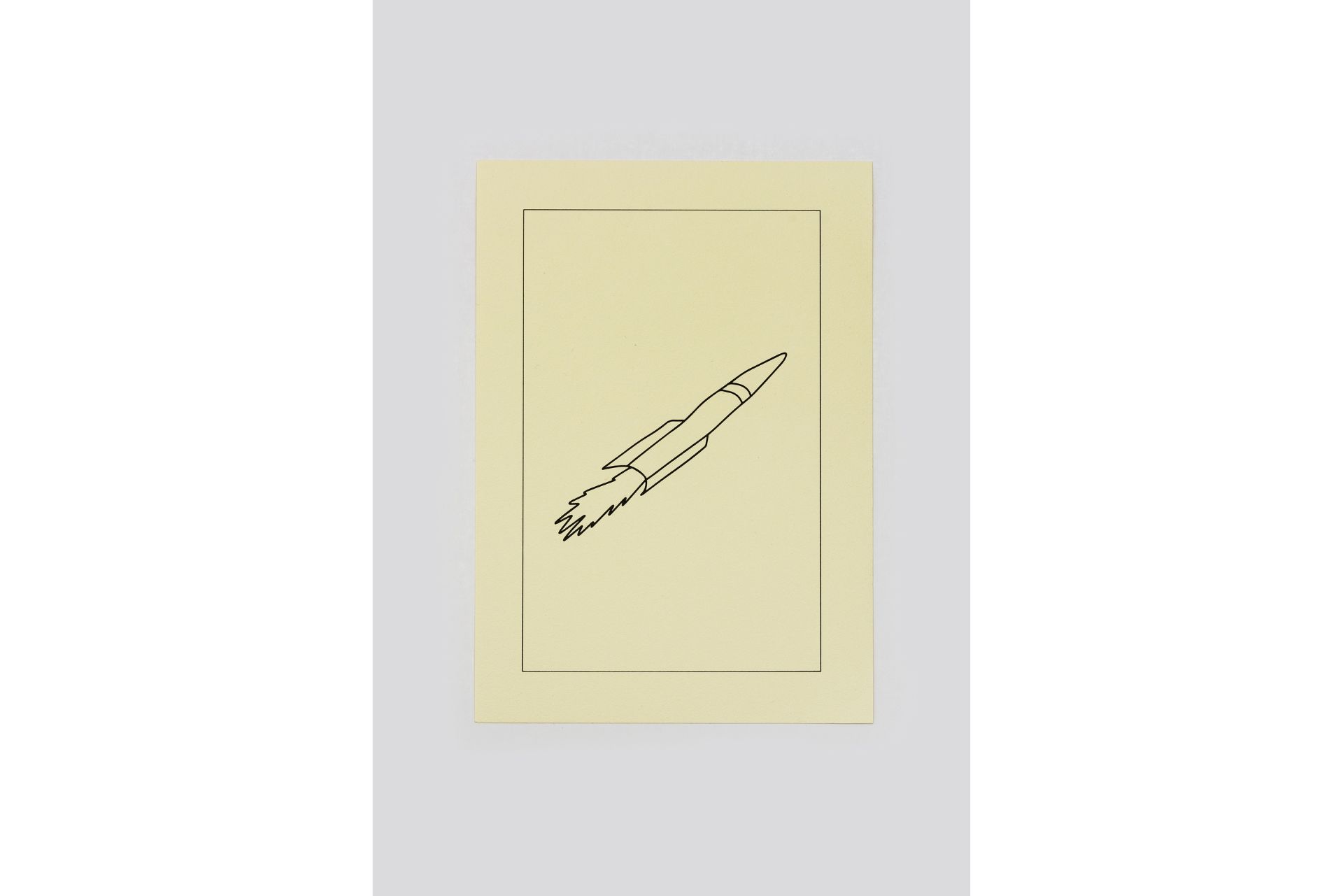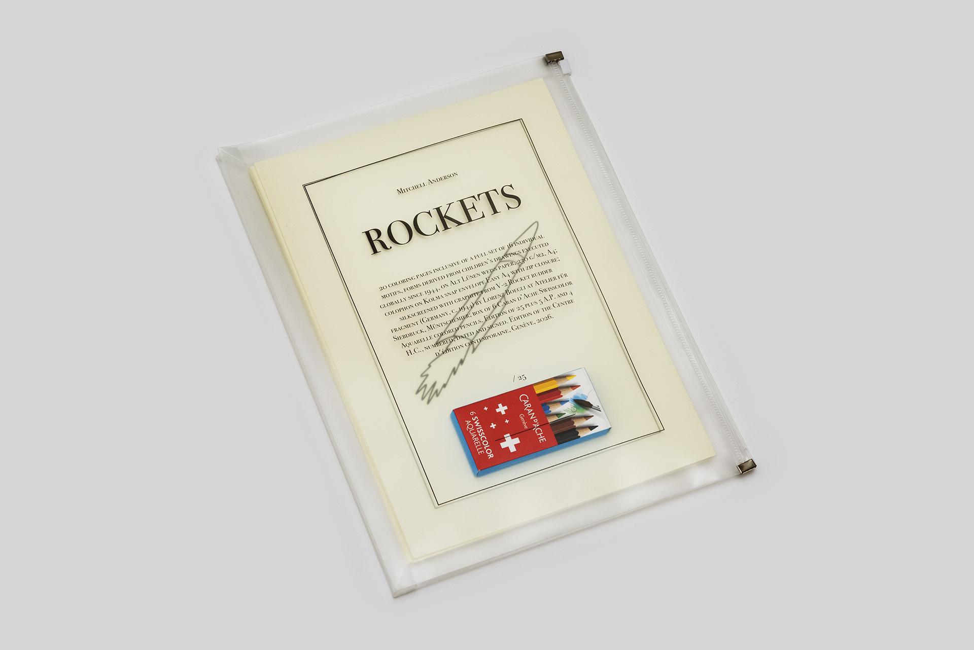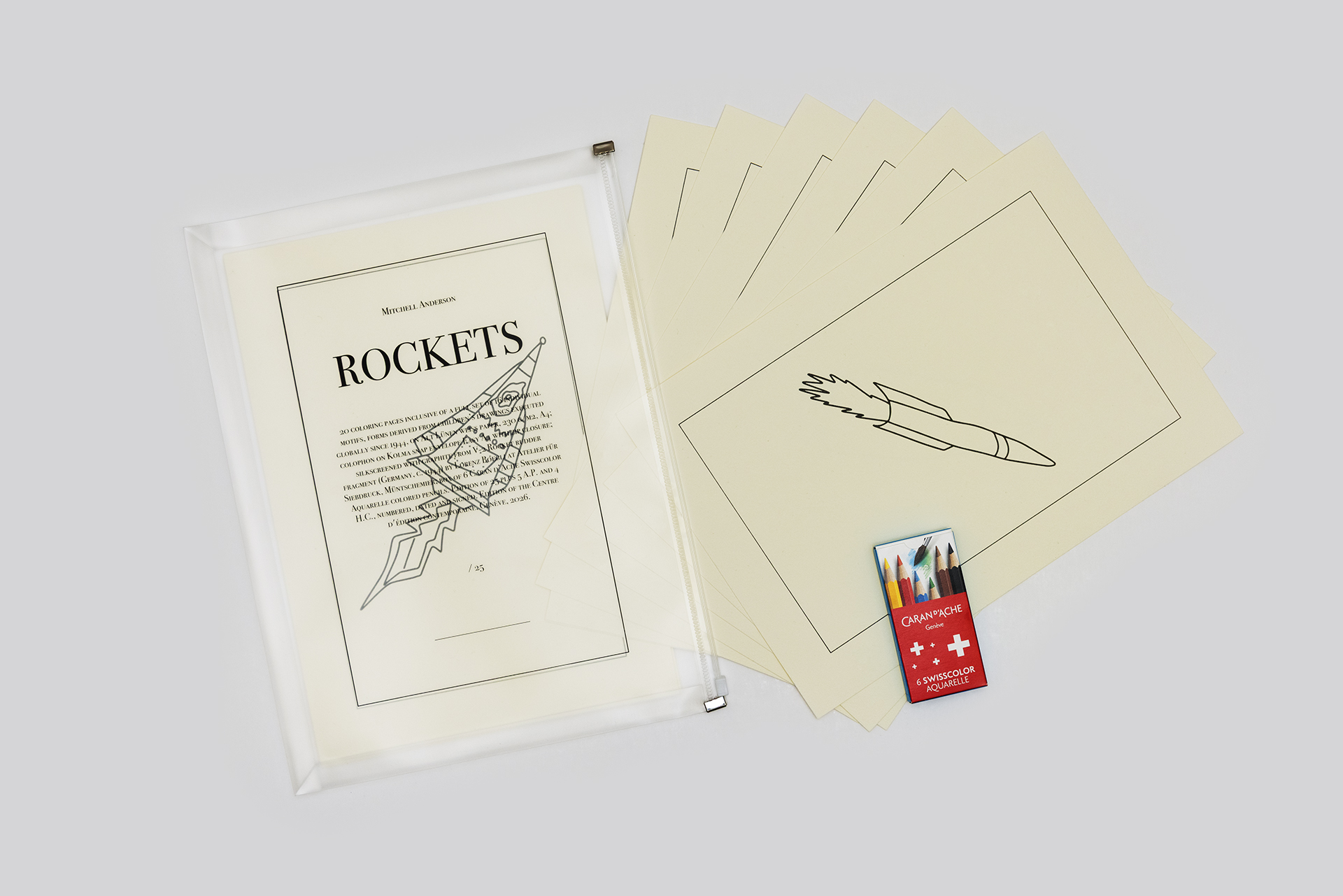 Mitchell Anderson, Rockets, 20 pages à colorier comprenant un ensemble complet de 16 motifs individuels, formes dérivées de dessins d’enfants réalisés dans le monde entier depuis 1944, sur papier Alt Lünen Weiss, 230 g/m2, A4; colophon sur une enveloppe Kolma snap Easy A4 avec fermeture à glissière; sérigraphiée avec du graphite provenant d’un fragment de gouvernail d’une fusée V-2 (Allemagne, vers 1944) par Lorenz Boegli à l’Atelier für Siebdruck, Müntschemier; boîte de 6 crayons de couleur aquarelle Caran d’Ache Swisscolor. Édition de 25 plus 5 e.a. et 4 H.C., numérotées, datées et signées. Édition du Centre d’édition contemporaine, Genève, 2026.