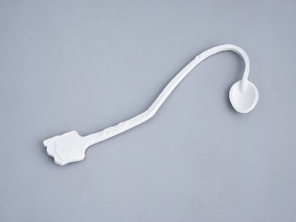 Ce display combine une tasse, quelques cuillères, un journal et une radio, qui suggère le rituel quotidien du petit déjeuner, ce set se révélera moins banal, innocent et confortable que notre service à café habituel et notre musique préférée du matin, mais fait plutôt ressurgir des souvenirs, qui réitèrent des failles entre un vécu et un ressenti personnel, la société, ses incohérences, ses dérives et ses injustices. Si ces ustensiles en porcelaine blanche rappellent le style bourguignon et le premier apprentissage de l’artiste, les motifs en relief de flammes, d’éclairs ou de fleurs sont réalisés dans un dessin très fin et élégant, qui semblent bien inoffensifs, la source réelle qui sous-tend la production de ces objets est d’une tout autre nature. Il s’agit en réalité et dans un format surdimensionné de la réplique d’une petite cuillère à café en plastique proposée dans les années 1970 par McDonald’s, rendue célèbre à l’époque par les dealers de cocaïne appréciant que son contenant corresponde exactement à 100 milligrammes. Cet ustensile qui aurait dû rester quasi invisible s’est transformé en cette célèbre « Cocaine McSpoon », symbole d’un marché bien plus puissant que celui du hamburger, obligeant McDonald’s à les retirer de leurs restaurants.